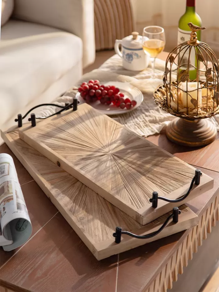 استقبل ضيوفك بأناقة مع صواني تقديم خشب المستطيلة الفاخرة، بتفاصيل هندسية راقية ومقابض معدنية تضيف لمسة من الفخامة والعملية إلى طاولة الضيافة. مثالية لتقديم المشروبات، الحلويات، أو تنسيق الزينة اليومية بأسلوب عصري ودافئ.