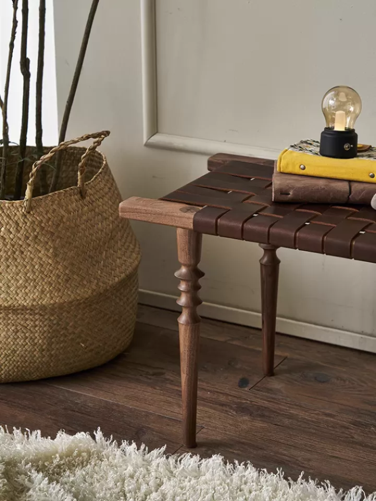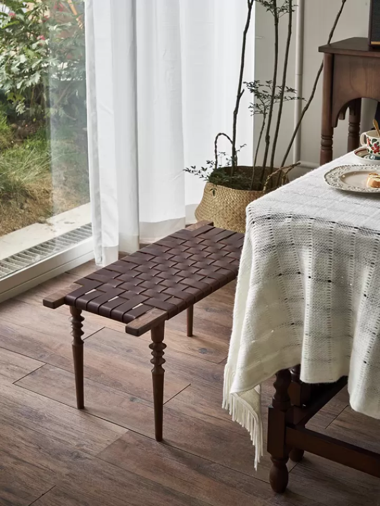 كرسي بانش من خشب الأوك الطبيعي مع مقعد جلد محاك يدويًا