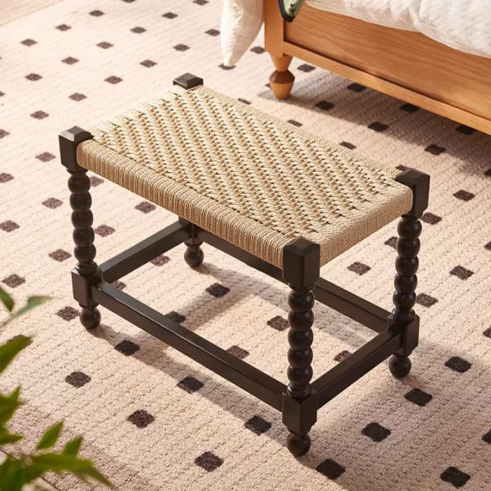 يتميز بتصميمه المستطيل وأرجله الدائرية ذات التفاصيل الدقيقة، ما يمنحه مظهرًا جذابًا يمكن استخدامه كـ مقعد وكرسي إضافي أو قطعة تزيينية فريدة في غرفة النوم أو المجلس أو المداخل، مع توازن مثالي بين القوة في الهيكل والنعومة في المقعد.